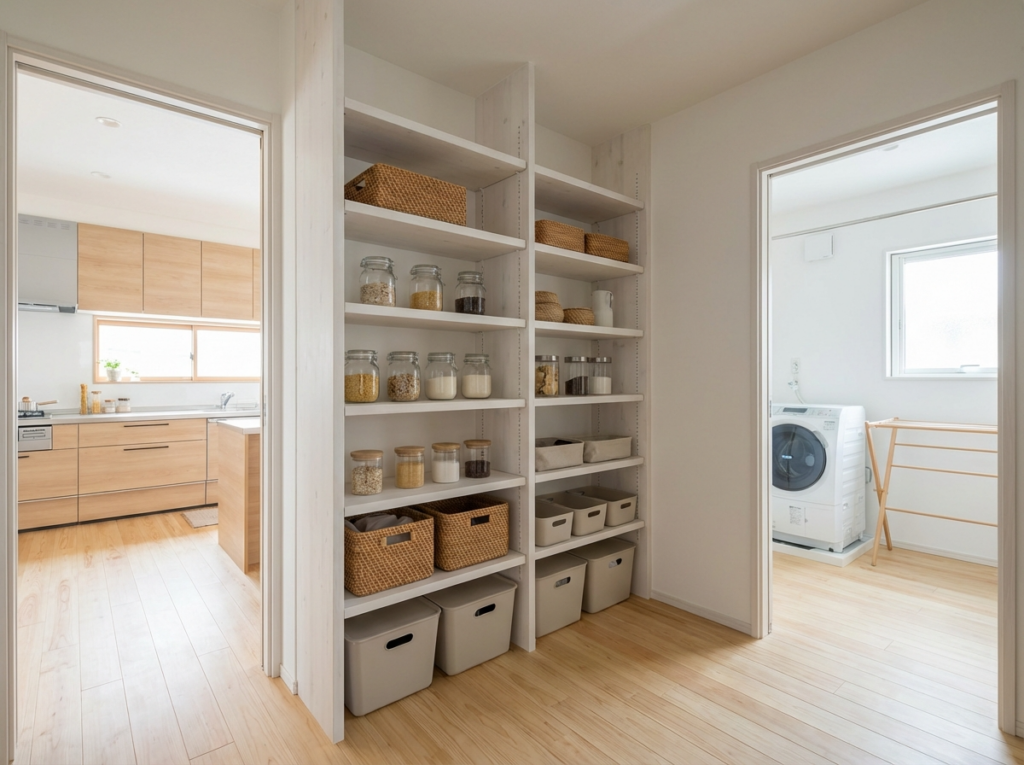 キッチン横にパントリーを設置し、その奥に洗面脱衣室を直結。買い物帰りの収納→料理→洗濯が最短距離で完結します。