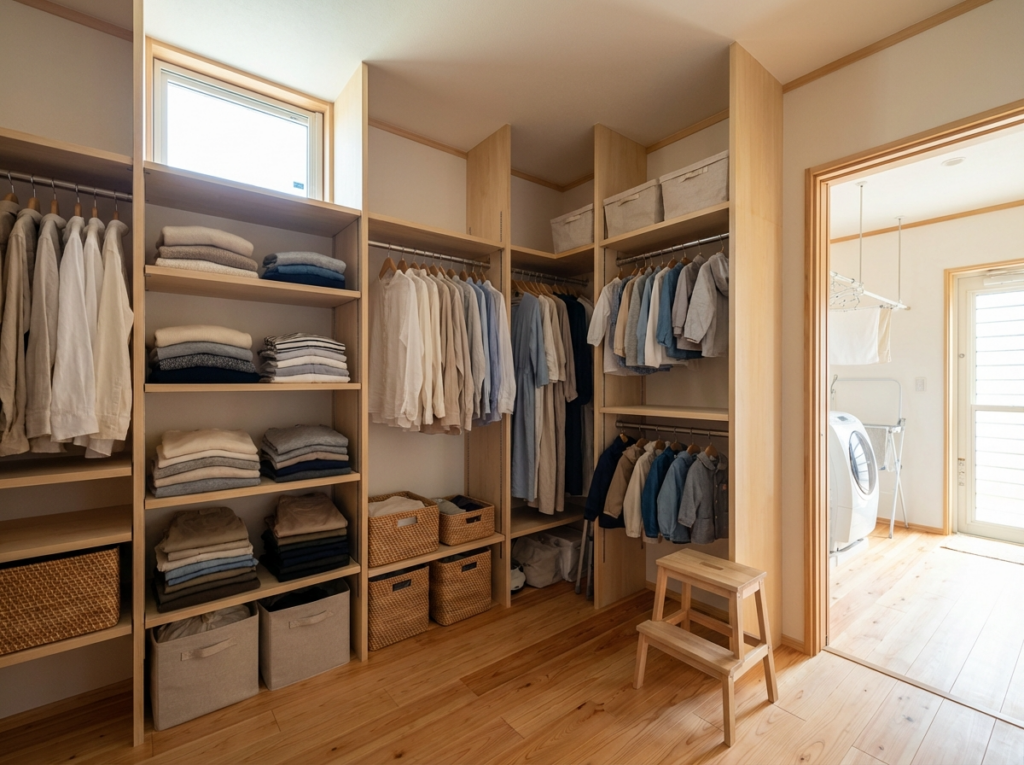 洗面脱衣室の隣に4畳のファミリークローゼットを配置。乾いた洗濯物をその場で収納。2階まで運ぶ手間がゼロになりました。