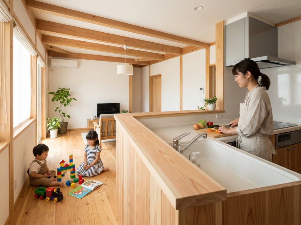ご要望の中心は「家事の動線をとにかく短くしたい」ということ。キッチンに立ちながら子どもの様子が見えること、洗濯物を最短距離で片付けられること。暮らしの流れを設計段階で徹底的にシミュレーションしました。