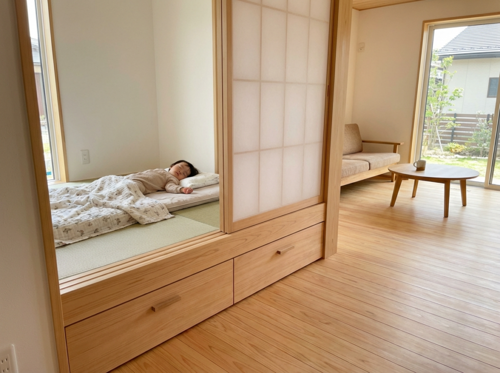 リビング横に3畳の小上がり和室。子どもの昼寝や遊び場として大活躍。引き戸を閉めれば客間にもなります。段差の下は大容量の収納です。