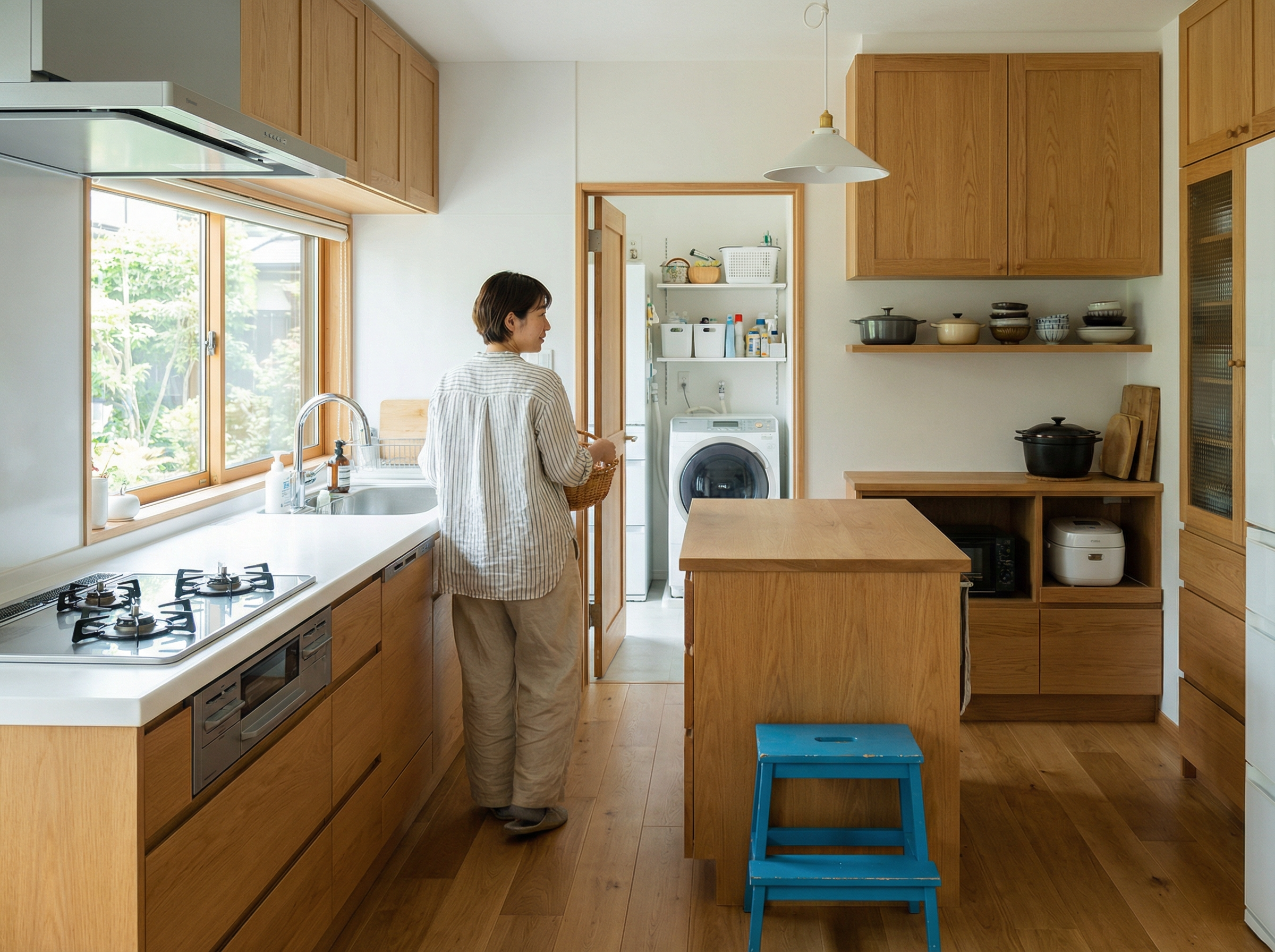 キッチン横にパントリーを設置し、その奥に洗面脱衣室を直結。買い物帰りの収納→料理→洗濯が最短距離で完結します。
